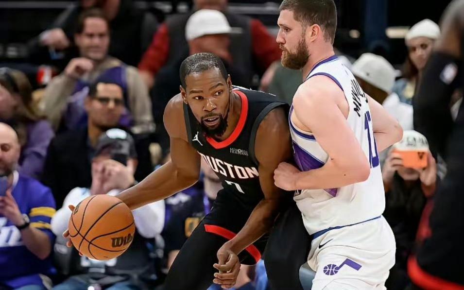 首节双方还称得上势均力敌,火箭靠着申京和阿门的个人能力勉强咬住比分,首节结束仅领先2分。但第二节风云突变,缺了亚当斯的火箭内线篮板瞬间成了灾难。爵士的体型优势彻底显现,乔治、米哈伊柳克、克拉克森、菲利波夫斯基轮番开火,单节37-25直接把分差拉开到11分。杜兰特手感冰凉,整支火箭几乎只剩阿门一个人在硬撑。